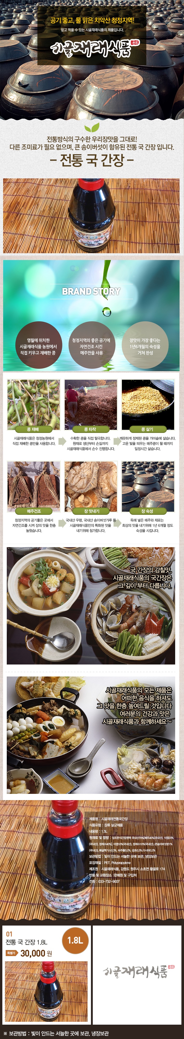 시골재래 전통국간장(1.8L)*국내산콩100%*자연숙성 한식간장으로 잡냄새을 제거하여 미역국 .탕국 등 각종요리시 깊은맛을 더합니다